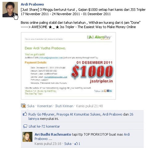 Dibawah ini adalah Bukti Pembayaran Jss Tripler yang masuk ke Alertpay
